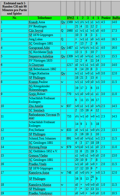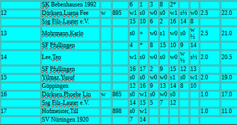 In der U14 wurde unsere Anna zweitbeste Spielerin mit Platz 5 von 19 Teilnehmer*innen (siehe Tabelle). Damit qualifizierte sie sich für die Württembergischen Meisterschaften Ende April.